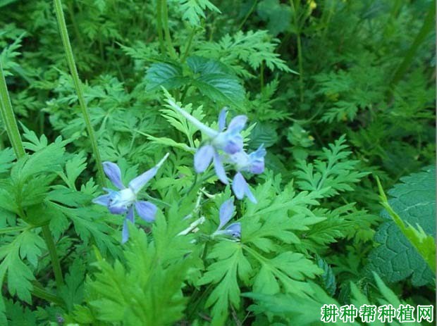 4、花:总状花序有花2~15朵,花序轴和花梗被反卷柔毛。苞片叶状。花梗长0.4~1.2cm。小苞片生于花梗中部,披针状线形。花径不超过1.5cm。萼片堇色或紫色,椭圆形至长圆形,长外疏被短柔毛。萼距钻形或圆锥状钻形,长5~15mm。花瓣紫色,无毛,上部变宽,具不等3个齿。退化雄蕊与萼片同色,无毛,瓣片扇形,2个深裂近基部,基部无花冠状突起。雄蕊无毛。心皮3个。子房疏被短毛或近无毛。