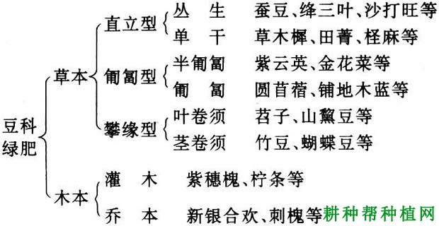 肥料的豆科植物。大多数豆科绿肥作物根系上着生根瘤,能将空气中氮素固定转化成有机氮化物,为植物提供氮素营养。在中国栽培利用的豆科植物共有50种左右,如紫云英、豇豆、沙打旺、紫花苜蓿、三叶草、柽麻等。豆科植物按植物学性状可分为草本和木本两大类,根据植物生长性状可分为直立型、匍匐型、攀缘型,其形态特征是羽状复叶,蝶形花冠、荚果。