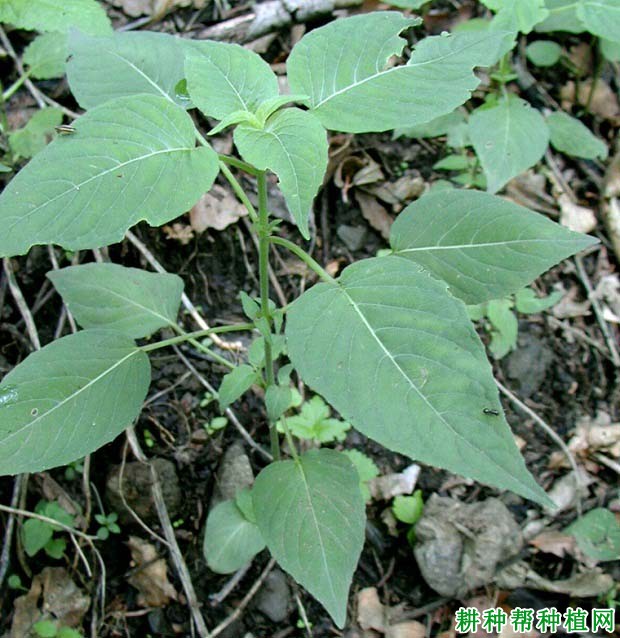 3、叶:对生。宽卵形或卵形,长4~12cm,宽3~7cm,先端急尖,基部浅心形或稍圆,边缘生不明显锯齿或近全缘。两面疏生开展短毛。柄长2~8cm。
