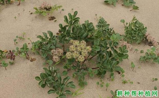 六、生物学特性:花期4~7月,果期6~8月。喜温暖湿润,主根深入沙层,能抗寒,耐干旱。适宜在平坦的沿海沙滩或排水良好的沙土和沙质土壤中生长,对肥力的要求不严,忌黏土和积水洼地。抗碱性强,是盐碱土的指示植物。