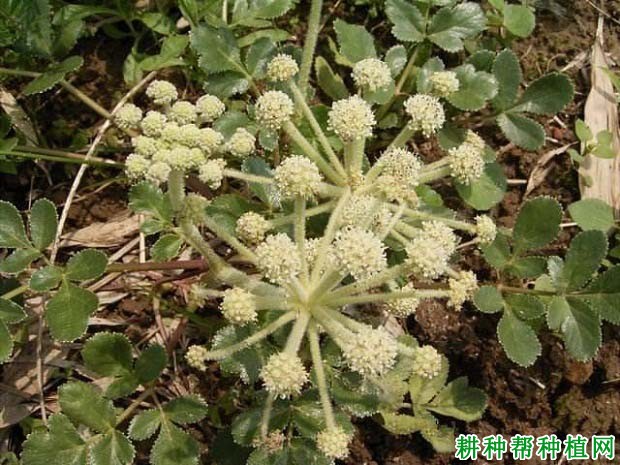 4、花:复伞形花序顶生,有时有侧生花序,总梗长4~10cm,密生白色或灰褐色茸毛。无总苞或有时1片。伞辐10~14个,不等长,密被白柔毛。小总苞片8~12片,线状披针形,边缘及背部被柔毛。小伞形花序多数。萼齿5片,细小,卵状披针形,被柔毛。花瓣5片,卵状披针形,白色或略带紫。雄蕊5枚,与花瓣互生,花药带紫褐色。花柱短,基扁圆锥形。