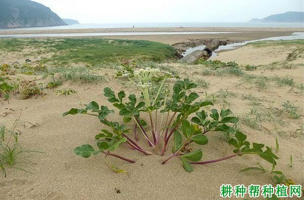 七、生长环境:生于我国沿海地区,尤以海滨沙滩上分布甚广,但具狭域生境特点。常和砂钻薹草、砂引草、肾叶打碗花、沙苦荬菜和单叶蔓荆等植物混生,在沙滩上形成海滨植物群落。