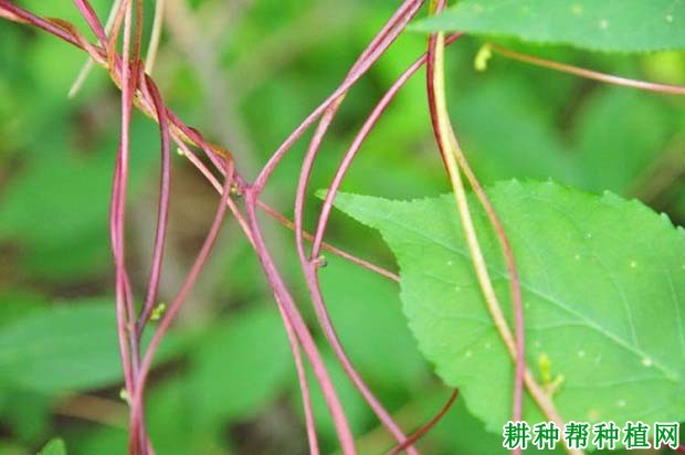 2、茎:较粗壮,肉质,径1~2mm,黄色,常带深红色小疣点,多分枝,无柄,缠绕于其他乔灌木或作物上。