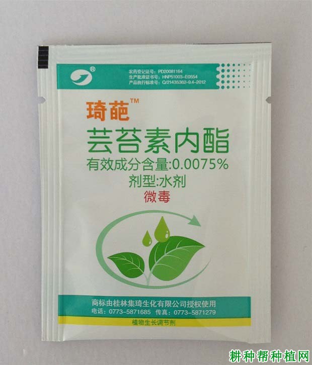 油菜素内酯为植物生长促进剂,极低浓度(0.1ng/L)即能显示其生理活性,主要生理作用是促进细胞分裂和伸长,提高根系活力,促进光合作用,延缓叶片衰老,提高植物的抗逆性,特别是对植物弱势器官的生长具有明显的促进作用。本品对人、畜低毒,大鼠急性口服和急性经皮LD5o均大于2000mg/kg,在植物体内和土壤中均无残留,施用安全。油菜素内酯用量小,效果明显,具有广泛的应用前景。