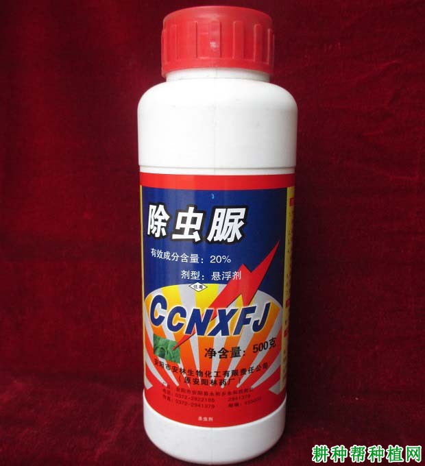 3、除虫脲理化性状:纯品为白色结晶,原药外观为白色至浅黄色结晶粉末。难溶于水,易溶于极性溶剂和乙腈,也可溶于一般极性溶剂于乙醇、二氯甲烷。遇碱易分解,对光、热均较稳定,常用制剂25%可湿性粉剂。