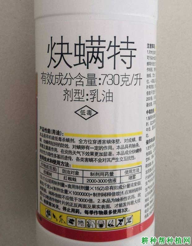 ③柑橘锈壁虱当有虫叶片达20%时,用73%乳油2000~3000倍液喷雾。隔20~30天再防治一次。注意本品对柑橘新梢嫩幼果有药害,应避免在新梢期用药。