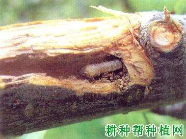 3、捕杀幼虫:利用幼虫有出蛀道啃食皮层的习性,于早晚在有新鲜粪屑的蛀道口,用铁丝钩出粪屑及其中的幼虫,或用粗铁丝直接刺入蛀道,以刺杀其中幼虫。