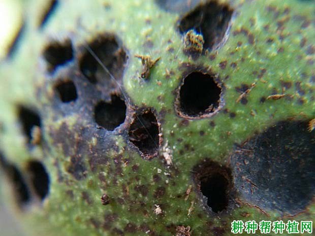 七、危害症状:以成虫蛀果或取食芽、嫩枝、叶柄,受害果被蛀成3~4mm近圆形的孔,严重时每果虫孔多达数个至数10个,并流出褐色汁液,以致种仁发育不良。芽、嫩枝、叶柄受害后,影响树势和翌年开花结果。初孵幼虫次日开始取食果皮,4~5日内蛀入果内,但不转果危害。幼虫在内果皮骨质化前主要取食种仁,向外排出黑褐色粪便,造成30%左右的早期落果;在内果皮骨质化后主要取食中果皮,以致果实外面留有条状下凹呈水浸状的黑褐色虫疤,造成种仁不饱满。
