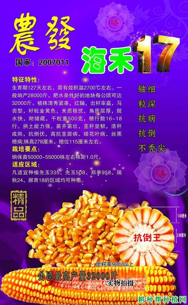 海禾17玉米品种有什么特点?海禾17玉米品种适宜在哪里种植?海禾17玉米品种亩产多少公斤?以下耕种帮种植网就作简单介绍,供网友们参考。