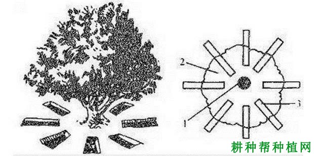 3、放射状施肥法:该方法在树冠下面距主干1米左右处开始,以主干为中心,向外呈放射状挖4~6条沟。沟一般深30厘米,将