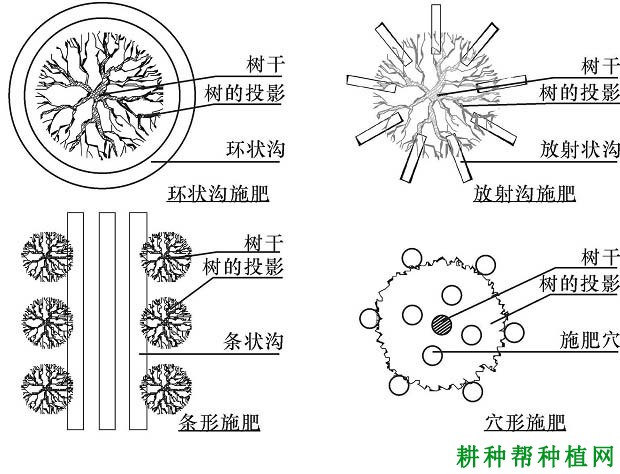 3、环状沟法:即在树冠外围开一环绕树冠的浅沟(深10厘米),将