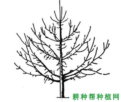 开心形树的结构:开心形树体结构是在多枝组丛状形树的基础上,在结果后逐渐改造而成。一般主干高30~35厘米,主干上着生2~3个小主枝;保留二个小主枝的为二主枝开心形,保留三个小主枝的为三主枝开心形。小主枝的基角在45°~50°,无侧枝,枝组为中小型枝组,树高1.5~2米。