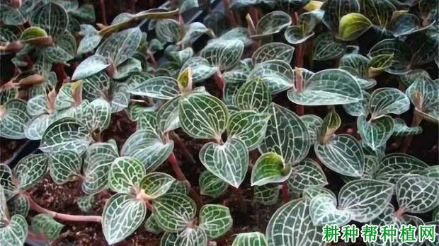 金线莲为陆生兰科植物,株高8~18cm。根状茎匍匐,伸长,肉质,具节,节上生根。茎直立,肉质,圆柱形。叶片卵圆形或卵形,长1.3~3.5cm,宽0.8~3cm,上面暗紫色或黑紫色,具金红色带有绢丝光泽的美丽网脉,背面淡紫红色,先端近急尖或稍钝,基部近截形或圆形,骤狭成柄;叶柄长4~10mm,基部扩大成抱茎的鞘。总状花序具2~6朵花,长3~5cm;花序轴淡红色,其和花序梗均被柔毛,花序梗具2~3枚鞘苞片;花苞片淡红色,卵状披针形或披针形,长6~9mm,宽3~5mm,先端长渐尖,长约为子房长的2/3;子房长圆柱形,不扭转,被柔毛,连花梗长1~1.3cm;花白色或淡红色,不倒置(唇瓣位于上方);萼片背面被柔毛,中萼片卵形,凹陷呈舟状,长约6mm,宽2.5~3mm,先端渐尖,与花瓣黏合呈兜状;侧萼片张开,偏斜的近长圆形或长圆状椭圆形,长7~8mm,宽2.5~3mm,先端稍尖;花瓣质地薄,近镰刀状,与中萼片等长;唇瓣长约12mm,呈Y形,基部具圆锥状距,前部扩大并2裂,其裂片近长圆形或近楔状长圆形,长约6mm,宽1.52mm,全缘,先端钝,其两侧各具6~8条长4~6mm的流苏状细裂条,距长5~6mm,上举指向唇瓣,末端2浅裂,内侧在靠近距口处具2枚肉质的胼胝体;蕊柱短,长约2.5mm,前面两侧各具1枚宽、片状的附属物;花药卵形,长4mm;蕊喙直立,叉状2裂;柱头2个,离生,位于蕊喙基部两侧。