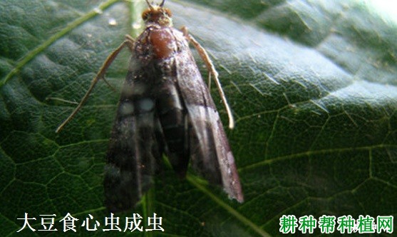 大豆食心虫别名豆卷叶螟、大豆蛀荚虫、小红虫,属于鳞翅目、小卷蛾科。成虫灰褐色,体长5~6毫米,翅展12~14毫米。前翅近长方形,前缘有10条左右紫黑色短斜纹,周围黄色。后翅浅灰色。卵椭圆形稍扁平,初产白色,孵化前橙黄色,卵粒一端出现1个小黑点(幼虫头部)。幼虫圆筒形,初孵黄白色后变橙红色,体长7.3~9.5毫米。3龄幼虫体背均有点刻。蛹黄褐色,第2~7节背面前后缘有大、小刺各1列,8~10节只有大刺1列。蛹藏在由幼虫吐丝制成的筒形土茧内,茧一端较粗。