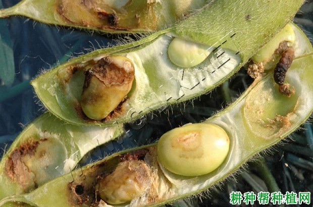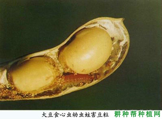 大豆食心虫食性单一,主要为害大豆及野生大豆。苦参也可受害。以幼虫钻蛀豆荚食害豆粒,将豆粒咬成沟道或残破状,严重影响大豆产量和品质。