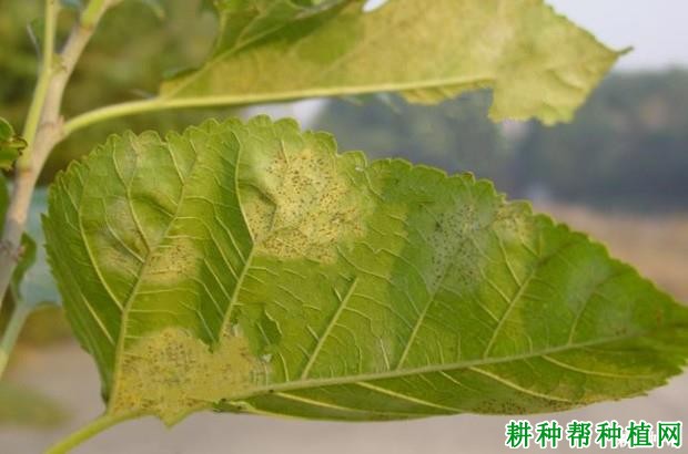 桑里白粉病发病初期,在中下部老叶背面散生白色细小的霉斑,逐渐扩大,甚至连接成片。霉斑表面呈粉状,即病菌的菌丝体和分生孢子。后期在白色斑上出现黄色小粒状物,并由黄转橙红再变褐,最后呈黑色时,白色粉霉消失。