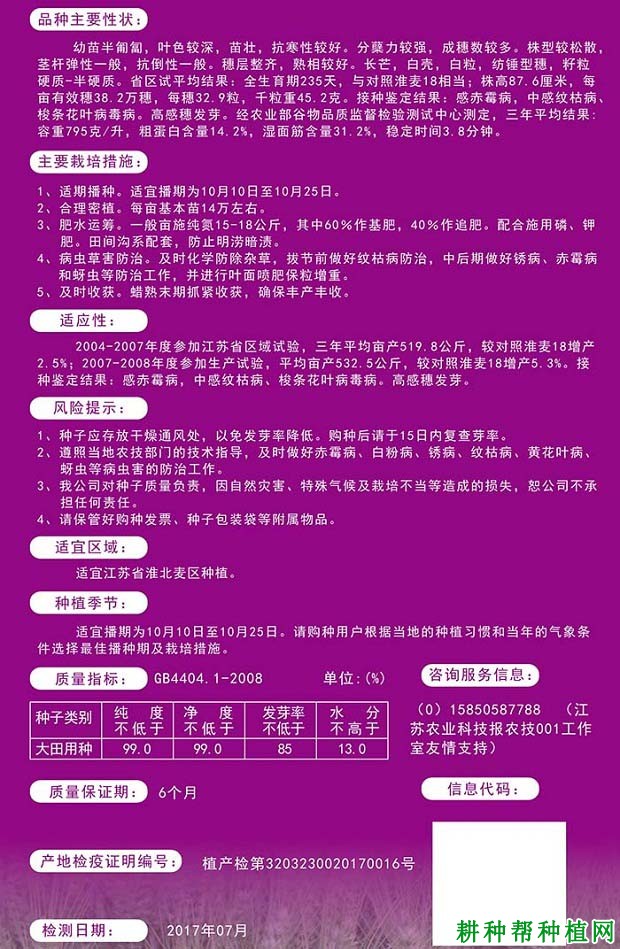 幼苗半匍匐,叶色较深,苗壮,抗寒性较好。分蘖力较强,成穗数较多。株型较松散,茎杆弹性一般,抗倒性一般。穗层整齐,熟相较好。长芒,白壳,白粒,纺锤型穗,籽粒硬质-半硬质。省区试平均结果:全生育期235天,与对照淮麦18相当;株高87.6厘米,每亩有效穗38.2万穗,每穗32.9粒,千粒重45.2克。接种鉴定结果:感赤霉病,中感纹枯病、梭条花叶病毒病。高感穗发芽。经农业部谷物品质监督检验测试中心测定,三年平均结果:容重795克/升,粗蛋白含量14.2%,湿面筋含量31.2%,稳定时间3.8分钟。