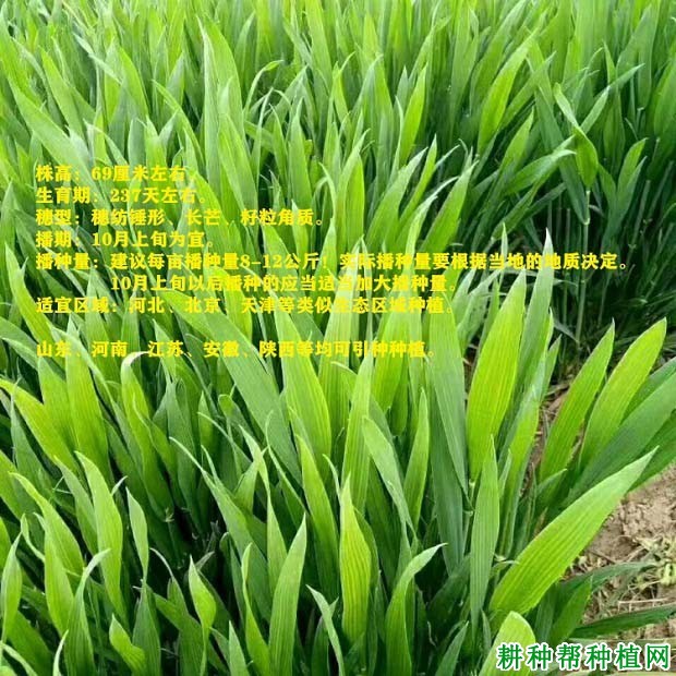 幼苗半匍匐,叶片深绿色、下披,分蘖力较强。属半冬性中熟品种,生育期243天左右,成株株型较松散,株高74cm。穗纺锤形,长芒,白壳,白粒,硬质,籽粒较饱满。亩穗数40.9万,穗粒数31.9个,千粒重34.6g,容重790.6g/L。抗倒性较强,抗寒性与对照相当。2008年河北省农作物品种品质检测中心测定,籽粒粗蛋白质(干基)15.25%,沉降值20.6mL,湿面筋35.1%,吸水率60%,形成时间3.6分钟,稳定时间2.5分钟。