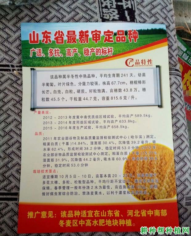 适宜播期10月5日~10日,亩基本苗20~22万。该品种属于多花大穗、多粒、松散型品种,平均行距不宜过小,播后及时镇压保墒。春季管理一般年份浇2水为最佳,亩追施