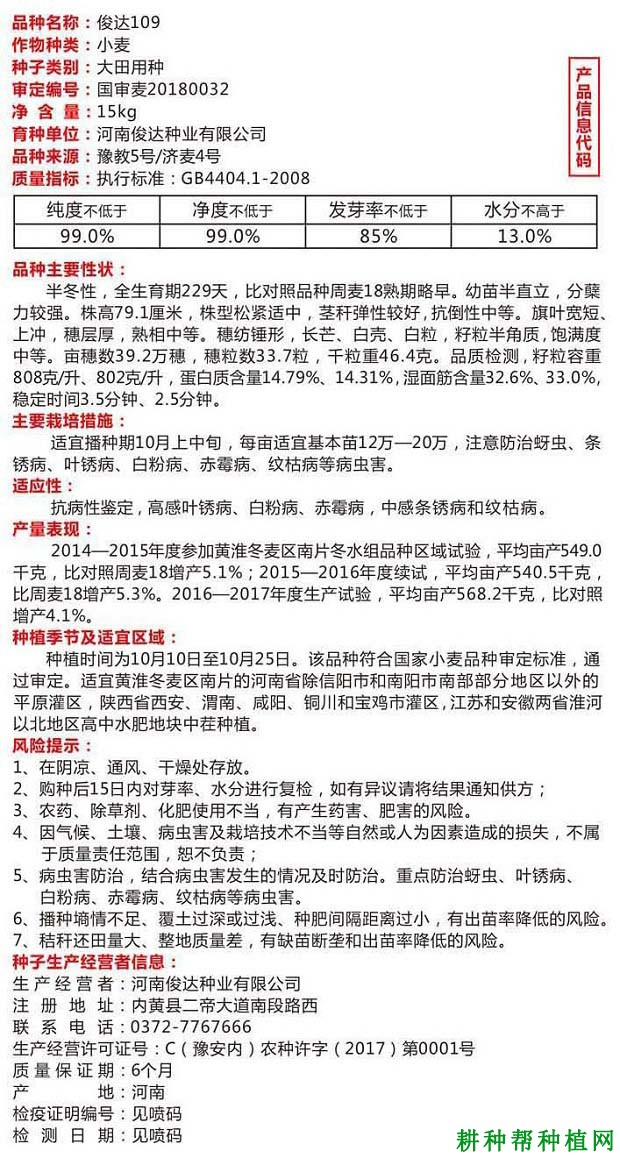 栽培技术要点:适宜播种期10月上中旬,每亩适宜基本苗12万-20万,注意防治蚜虫、条锈病、叶锈病、白粉病、赤霉病、纹枯病等病虫害。