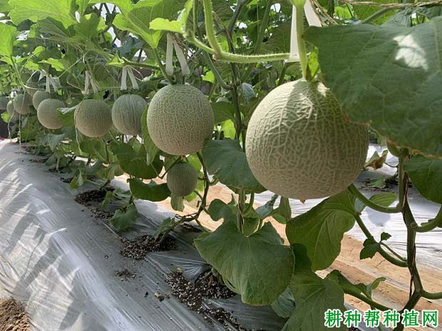 品种特性:网纹类厚皮甜瓜,植株生长势较强,茎蔓粗壮,叶片中等大小,近圆形,叶色深绿,易坐果,坐果整齐一致。雄花完全花同株。雌花在主蔓上发生较晚,而在子蔓上发生较早,子蔓、孙蔓均可坐果,中抗白粉病。属中晚熟品种,全生育期110~120 d,坐果到成熟约40~45 d。果实圆形,果皮墨绿,上覆浅绿色-白色网纹,果肉绿色,种腔小,果肉厚4.3~4.6 cm,果实中心可溶性固形物含量14.5%~15.6%,松脆爽口,平均单果质量1.8~2.1 kg,平均单产每667 m2为2 800~3 300 kg,果实商品率95%以上。果实成熟后不落蒂,耐贮运性好,常温下可存放15 d以上外观品质不变。杂种一代种子黄白色,千粒质量25 g左右。