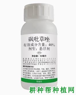 9.使用方法。在大豆、棉花、花生、马铃薯等作物上使用时,可在播种后至出苗前期,用40%砜吡草唑悬浮剂25~30ml,对水15~20L,进行土壤喷雾,可有效杀灭所有杂草;在冬小麦上使用时,可在冬小麦播种后至禾本科杂草1.5叶期,在土壤墒情良好或灌溉、降雨后,每亩用40%砜吡草唑悬浮剂25~30ml,对水15~20L,进行土壤喷雾,可有效杀灭冬小麦田大部分杂草。