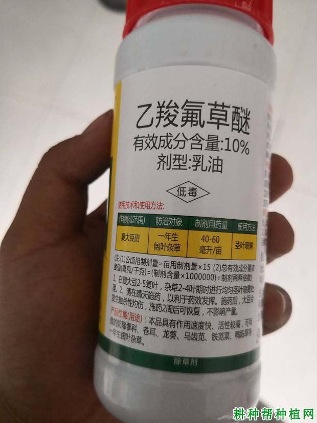 3.用于大豆:在大豆2片复叶期,阔叶杂草2~5叶期,杂草已基本出齐时,每亩用10%乙羧氟草醚乳油50-60室升,兑水30千克均会喷雾。