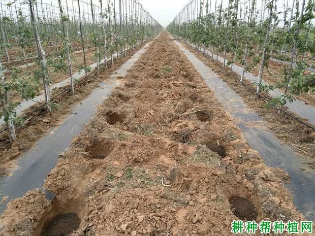 7.有机肥和化肥混匀后在9月中旬到10月中旬施用(晚熟品种采果前后尽早施用)。施肥方法采用穴施或沟施,穴或沟深度40厘米左右,每株树3-4个(条)。