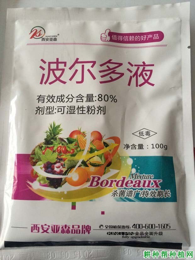 杀菌剂,由硫酸铜和石灰乳配制而成。有效成分为碱或硫酸铜,喷洒药液后在植物体和病菌表面形成一层很薄的药膜。该药膜不溶于水,但在二氧化碳、氨、树体及病菌分泌物的作用下,使可溶性铜离子逐渐增加而起杀菌作用,可有效地阻止孢子发芽,防止病菌侵染,并能促使叶色浓绿,生长健壮,提高树体抗病能力。该药剂具有杀菌谱广、持效期长、病菌不会产生抗性、对人畜低毒等特点,是应用历史最长的一种