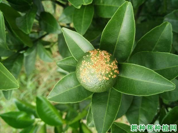 茶褐色小斑,后在果皮上形成黄褐色圆锥形,木质化的瘤状突起。疮痂病只侵染柑橘的幼嫩组织,春梢和幼果期温度适宜、多雨时易爆发,此时是防治重点时期。