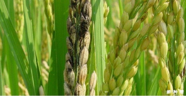 3、谷粒变暗绿色,不开裂,不充实,与青粒相似,有的谷粒变为焦黄色,手捏有松软感,病粒用水浸泡变黑。