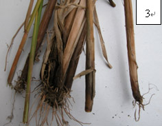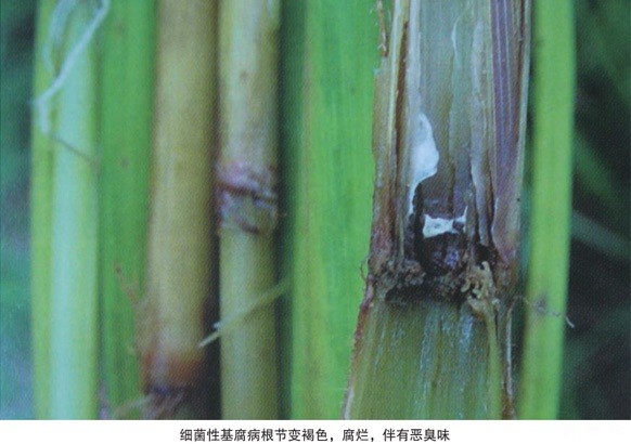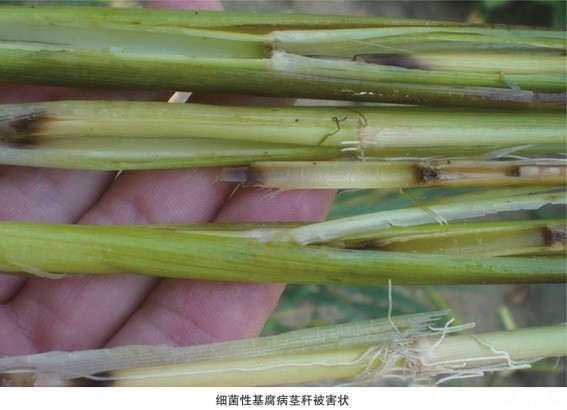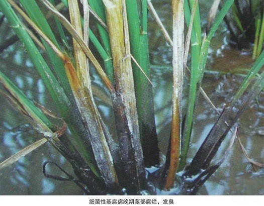 2、在6月中旬,水稻进入分蘖盛期以后气温逐渐升高,开始发病,气温在28度以上,地势低洼排水不良,水温偏高发病严重。在孕穗以后引起枯穗半枯穗,秕谷率大增。水稻细菌性基腐病株易齐泥拔断。病的独特症状是:①病株根节变为褐色或深褐色腐烂,有别于细菌性褐条病心腐型、白叶枯病急性凋萎型及螟害枯心苗等。②该病常与小球菌核病、恶苗病、还原性物质中毒等同时发生;也有在基腐病株枯死后,恶苗病菌、小球菌核病菌等腐生期上。③该病主要通过水稻根部和茎基部的伤口侵入。生产上只要抓准基腐病这三个独特症状,是能与上述病害区别。