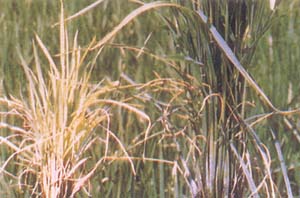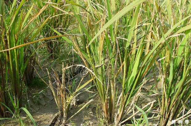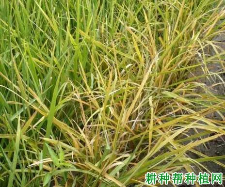 水稻成株发病,先从心叶发黄,而后叶鞘黄化,最后全株褪色变黄,分蘖黄化矮缩,只有健株的一半高,并在分蘖上长出不定根。一般发病早的植株多枯死,发病迟的呈包茎穗,结实不良。