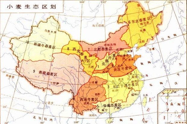 我国小麦分布广,全国各地都有种植。由于各地自然条件不同,形成明显的不同种植区。早在1936年依气候及小麦生产状况把中国小麦分为7个区域,其中6个冬麦区,1个春麦区;1937年又根据100多个小麦品种在8省9个地点进行3年区域适应性试验的结果,把6个冬麦区归为3个主区。这是中国小麦区分最早研究。1943年依据中国小麦冬、春性,籽粒色泽和质地软硬,将全国主要麦区划分为硬质红皮春麦区,硬质冬、春麦混合区,软质红皮冬麦区3个种植区。60年代初,《中国小麦栽培学》又将全国小麦划分为北方冬麦区、南方冬麦区和春麦区3个主区和10个亚区,为中国较完整的小麦分区奠定了基础。尤其是冬、春小麦分界线和各主要麦区的划分得到重新确定。以后气象,品种和栽培等学科的科学工作者根据各自学科的特点相继提出不同的区划。《中国小麦品种及其系谱》一书以《中国小麦栽培学》的区划为基础,直接划分为10个麦区,有的区还进一步划分了若干副区。80年代以来,全国小麦生产迅速发展,有关小麦区划的资料不断丰富,认识也在不断深化。为此将全国小麦种植区划在原有的东北春麦、北部春麦、西北春麦、新疆冬春麦、青藏春冬麦、北部冬麦、黄淮冬麦、长江中下游冬麦、西南冬麦以及华南冬麦10个麦区基础上,重点对区属范围及分区走向进行了相应的修订与调整。