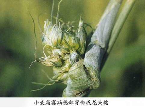 3、小麦穗期受害症状:小麦穗期症状的特点是形成各种“疯顶症”,例如病株剑叶特别宽、长、厚,叶面发皱并弯曲下垂,穗茎曲屈或弯成弓形;穗型大或小,花不实;有时基部小穗轴长,呈分枝穗状,下部小穗的颖壳长成绿色小叶片;也有的穗头呈龙头状扭曲。