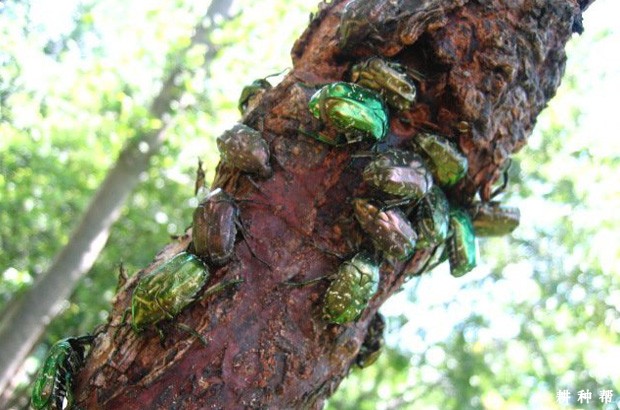 3、铜绿丽金龟:1年1代,以幼虫越冬。春季10厘米土温高于6℃时开始活动,3~5月份有短时间为害。当10厘米土温低于10℃时,开始下潜越冬,越冬深度大多在20~50厘米土层。