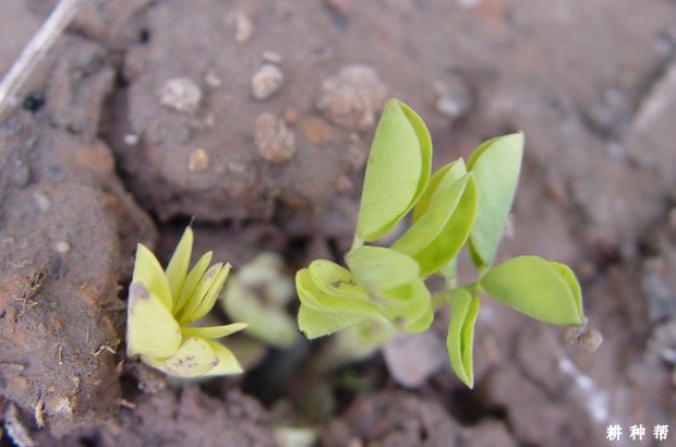 花生从播种到50%的幼苗出土并展开第一片真叶为种子发芽出苗期。在正常年份,淮北地区春播早熟品种需10~15天;中晚熟品种需12~18天;夏播花生只需5~10天。该时期生长最快的器官是根和胚轴,在出苗时植株主根可达30厘米以上,并且产生了许多侧根。种子发芽出苗的好坏,主要决定于温度和土壤水分。所以,适时、适墒播种可以确保花生种子正常发芽出苗。
