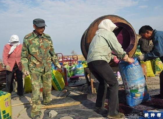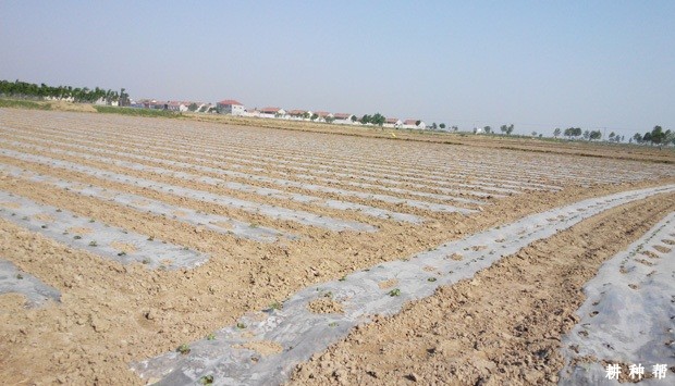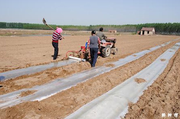 人工覆膜:3~4人一组,先开沟,沟深5~8厘米,将地膜展平,然后将膜边缘埋入沟内,用土压严压实。