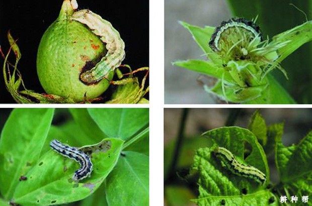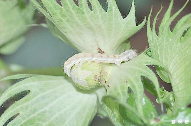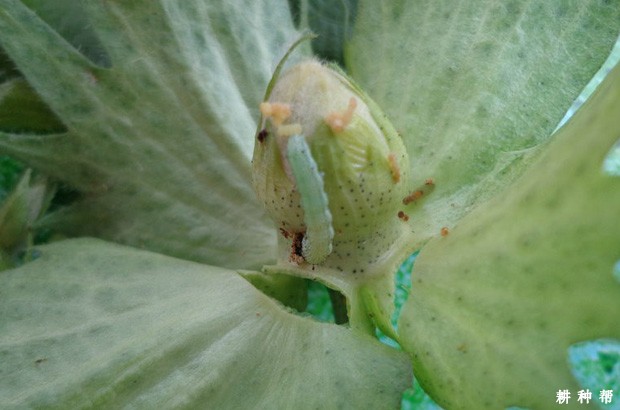 棉铃虫的幼虫食害嫩叶成缺刻或孔洞;受害的棉蕾后苞叶张开变黄,蕾的下部有蛀孔,直径约5毫米,不圆整,蕾内无粪便,蕾外有粒状粪便,蕾苞叶张开变成黄褐色,2~3天后即脱落。青铃受害时,铃的基部有蛀孔,孔径粗大,近圆形,粪便堆积在蛀孔之外,赤褐色,铃内被食去一室或多室的棉籽和纤维,未吃的纤维和种子呈水渍状,成烂铃。
