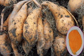 特征特性:顶叶淡褐色,叶形浅复,叶脉紫色,茎绿带紫色,株形匍匐,薯块外皮橙黄色,薯肉桔红色,薯形下膨较美观,耐贮性中等,萌芽性好。干物率19.56%,食味63.6分,鲜薯胡萝卜素含量高,每百克10.97毫克,淀粉率9.54%,维生素C含量每百克17.92毫克。中抗薯瘟病。