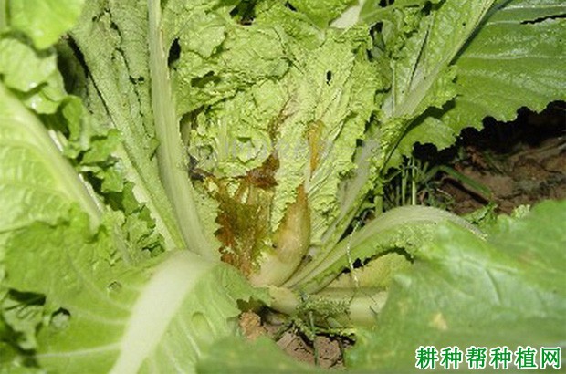 2、心腐型:病原由菜帮基部伤口侵入菜心,形成水浸状湿润区,逐渐扩大后,变为淡灰褐色,发病组织呈粘滑软腐状。菜心部分叶球腐烂,结球外部无病状。