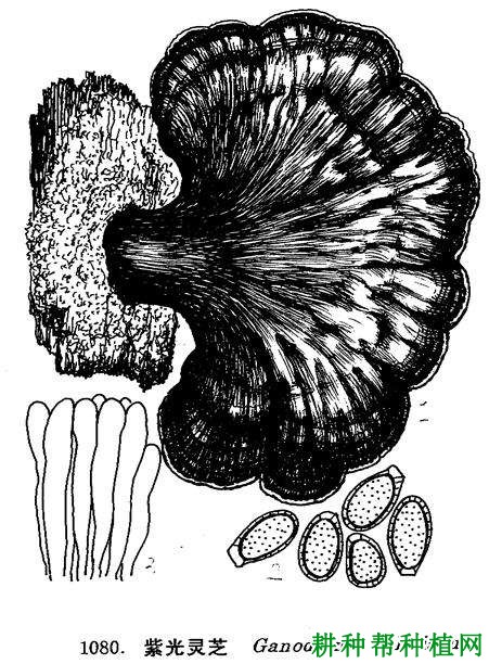 紫光灵芝一年生,无柄,木栓质。菌盖半圆形、近圆形或贝壳状,有时呈不规则形,5~7厘米X4~11厘米,厚0.5~1厘米,表面紫褐色到黑褐色,有似漆样光泽,具环棱和环纹并有纵皱,边缘圆钝;菌肉分两层,上层白色,下层深褐色,厚0.3~0.5厘米;菌管褐色到深褐色,长约0.7厘米;孔面淡褐色到栗褐色;管口略圆形,管壁较厚,每毫米4~5个。皮壳呈不规则的拟子实层型,淡褐色到褐色,组成菌丝棍棒状或不规则形,顶端膨大部分宽4.5~7微米,长18~25微米。与菌肉容易分离。