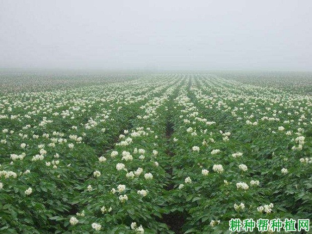 钾肥,防止后期植株早衰。选择土层深厚,土壤疏松肥沃,排灌良好、微酸性沙壤土或壤土。播种前催芽;种薯切块时充分利用顶芽优势,每一个切块重30~40克,带有1~2个芽眼。当10厘米土壤温度稳定在8℃时播种;密度4000~4500株/亩。施用有机肥做