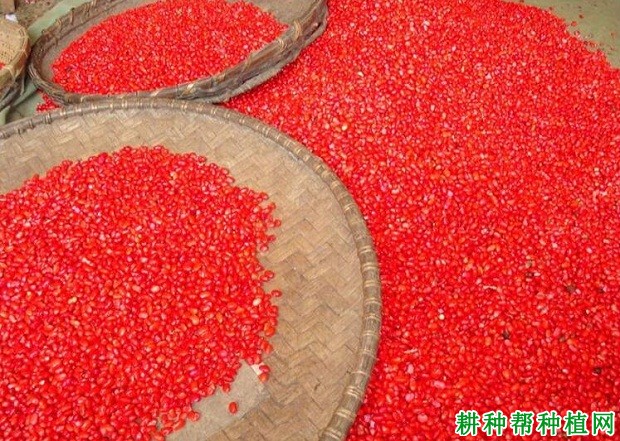 三七果实一般称为红籽,于11~12月成熟,当果实鲜红发亮时即可采收作种。采收过迟变成紫红色,果实易脱落;采收过早,果实为紫绿色,发芽率低,而且幼苗发育很差。应选留3~4年生植株所结的果实作种,颗粒大而充实的果实发芽率高。三七种子成熟时,随红随采,连花梗一起摘下,除去水泡子和花盘,即得纯净的红籽。