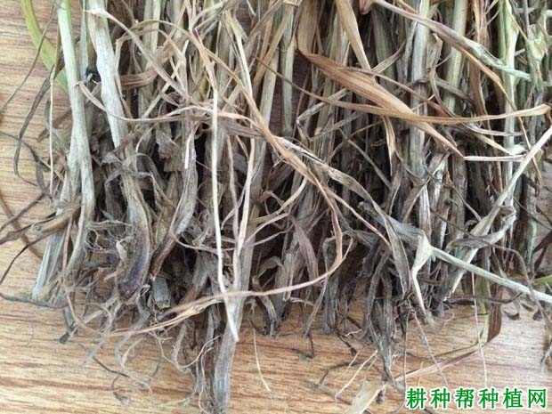 2、根部受害症状|:植株根部受害产生褐色或黑色病斑,植株茎基部出现褐色条斑,严重时茎折断枯死,或虽直立不倒,但提前枯死。枯死植株青灰色,白穗不实,俗称“青死病”。拔起病株可见根毛和主根表皮脱落,根冠部变黑并粘附土粒。