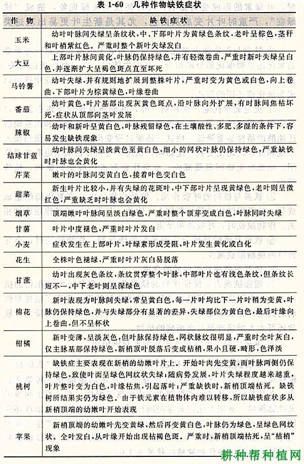 ③对铁较敏感的作物有蚕豆、大豆、玉米、马铃薯等,如在缺铁土壤上对玉米施用铁肥,增产幅度可达5.8%~12.9%。