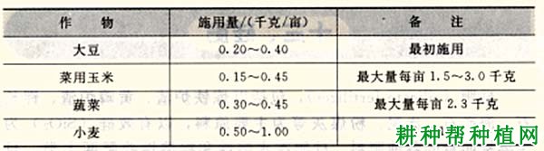 基肥、叶面喷施和种子处理等。撒施时必须耕入土中,施匀才能有较好效果。不宜与大量营养元素