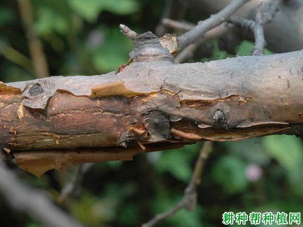 1、干腐型:由主枝基部开始发病,尤其是在遭受冻害的部位,初期为淡紫色病斑,沿枝干纵向扩展,使组织干枯,呈稍凹陷状,表面粗糙甚至龟裂,病部与健康部位之间易裂开,后期病斑表面密生黑色小粒点。幼树上,初于嫁接口或砧木剪口附近形成不整形紫褐色至黑褐色病斑,沿枝干逐渐向上或向下扩展,使幼树迅速枯死。