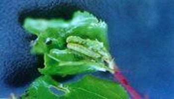 3、顶芽卷蛾的幼虫孵出后吐丝缀叶作苞,藏身其中,探身苞外取食嫩叶。