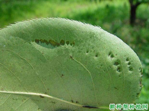 一般被害叶初期出现谷粒大小的淡绿色疤疹,而后逐渐扩大,并变为红色、褐色,最后变成黑色。疤疹多发生在主脉两侧和叶片的中部,常密集成行,嫩叶疙疹多时,使叶正面明显隆起,背面凹陷卷曲,严重时叶片早期脱落。削弱树势,影响花芽形成。